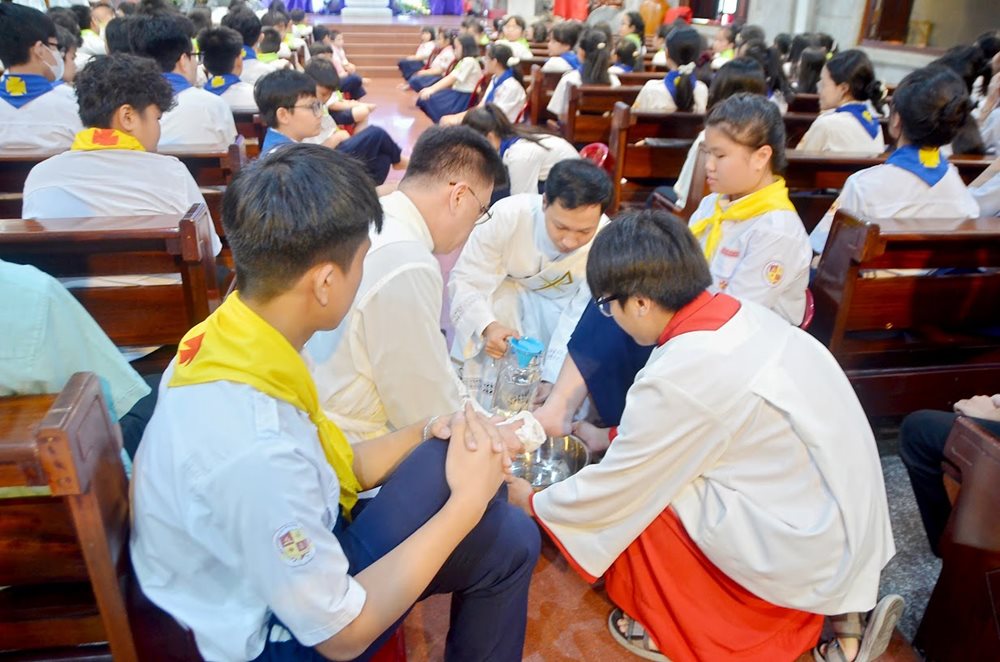 Sau bài giảng, theo gương Thầy Giêsu Chí Thánh, cha Martinô đã tái hiện cử chỉ yêu thương của Đức Giêsu khi quỳ xuống rửa