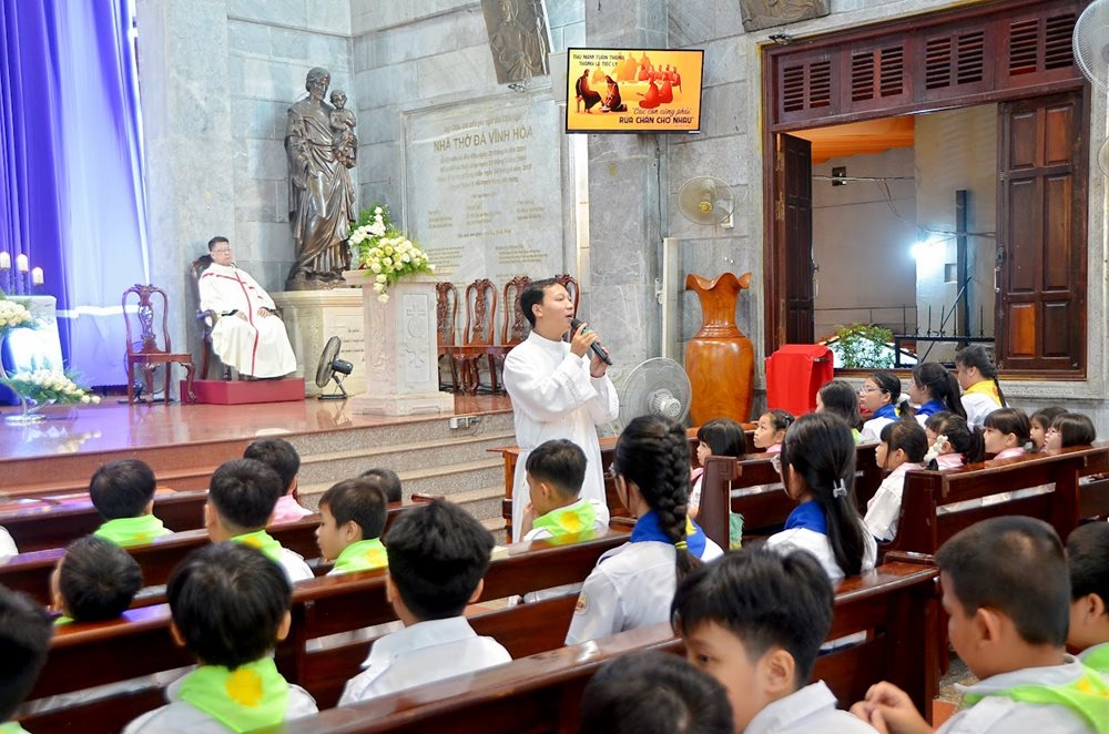 Kết thúc bài giảng, Thầy Phó tế Giuse nhắn nhủ các em thiếu nhi noi gương Chúa Giêsu qua đời sống yêu thương và phục vụ cụ thể: